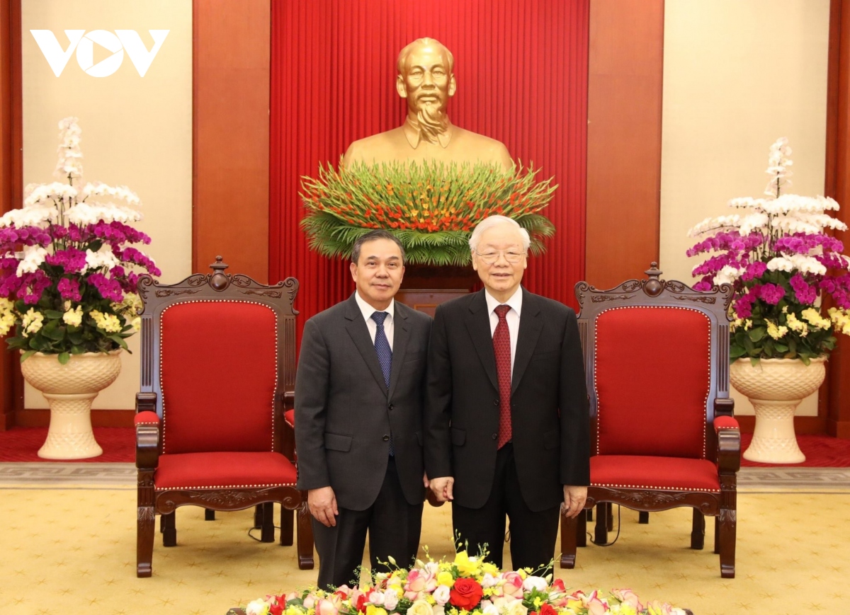 ທີ່ການຕ້ອນຮັບ, ທ່ານເລຂາທິການໃຫຍ່ ຫງວຽນຝູຈ້ອງ ໄດ້ຕີລາຄາສູງບັນດາ ການປະກອບສ່ວນຂອງເອກອັກຄະລັດຖະທູດໃນການຜັນຂະຫຍາຍບັນດາວຽກງານການຕ່າງປະເທດຂອງການນຳຂັ້ນສູງ, ຊຸກຍູ້ການຜັນຂະຫຍາຍບັນດາຂໍ້ຕົກລົງ ລະຫວ່າງ 2 ພັກ ແລະ 2 ປະເທດຢ່າງມີປະສິດທິຜົນ; ທ່ານເລຂາທິການໃຫຍ່ສະເໜີໃຫ້ທ່ານເອກອັກຄະລັດຖະທູດ ສືບຕໍ່ປະກອບສ່ວນຢ່າງຕັ້ງໜ້າ ເຂົ້າໃນການປັບປຸງການພົວພັນ ລະຫວ່າງສອງພັກ, ສອງລັດ ແລະ ປະຊາຊົນ 2 ປະເທດໃຫ້ເລິກເຊິ່ງ, ແທດຈິງ ແລະ ບັນລຸປະສິດທິຜົນກວ່າເກົ່າ. ທ່ານເລຂາທິການໃຫຍ່ ຫງວຽນຝູຈ້ອງ ຢືນຢັນວ່າ, ຍາມໃດ ຫວຽດນາມ ກໍ່ສະໜັບສະໜູນພາລະກິດແຫ່ງການປ່ຽນແປງໃໝ່ຂອງ ລາວ ແລະ ເຊື່ອໝັ້ນວ່າ ພາຍໃຕ້ການຊີ້ນຳນຳພາ ຂອງພັກປະຊາຊົນປະຕິວັດລາວ, ປະຊາຊົນ ລາວ ຈະສືບຕໍ່ຍາດໄດ້ຜົນງານໃໝ່ຢ່າງໃຫຍ່ຫຼວງກວ່າອີກ.