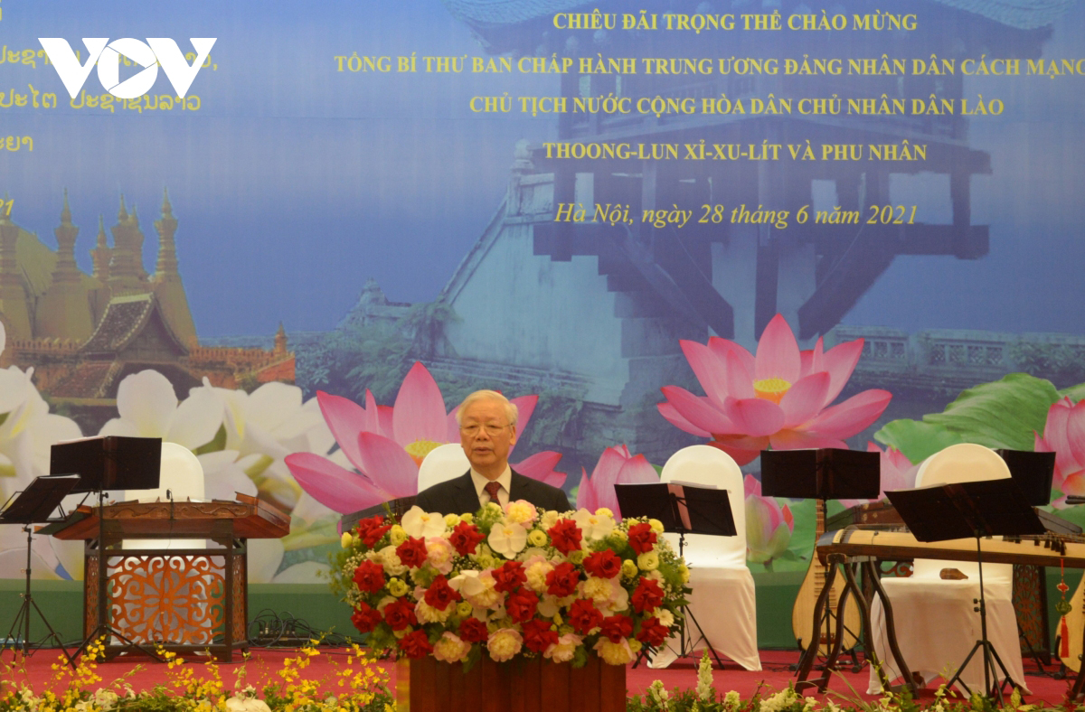 ຢູ່ທີ່ນີ້, ທ່ານເລຂາທິການໃຫຍ່ ຫງວຽນຝູຈ້ອງ ຢືນຢັນວ່າ ການຢ້ຽມຢາມຫວຽດນາມ ເປັນຄັ້ງທຳອິດໃນຖານະຕຳແໜ່ງເປັນເລຂາທິການໃຫຍ່, ປະທານປະເທດລາວ ຂອງທ່ານ ທອງລຸນ ສີສຸລິດ ແມ່ນເຫດການການເມືອງສຳຄັນຍິ່ງ, ແມ່ນຂີດໝາຍທີ່ມີຄວາມໝາຍປະຫວັດສາດໃນການພົວພັນລະຫວ່າງຫວຽດນາມ - ລາວ: