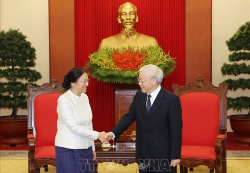 ທ່ານເລຂາທິການໃຫຍ່, ປະທານປະເທດ ຫງວຽນຝູຈ້ອງ ຕ້ອນຮັບທ່ານນາງປະທານສະພາແຫ່ງຊາດລາວ ປານີ ຢາທໍ່ຕູ້ (ພາບ:TTXVN) |