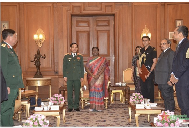 ສ່ວນທ່ານນາງປະທານາທິບໍດີ Droupali Murmu ຢືນຢັນວ່າ, ການຢ້ຽມຢາມຂອງຄະນະຜູ້ແທນຂັ້ນສູງກະຊວງປ້ອງກັນປະເທດ ຫວຽດນາມ ຈະຊ່ວຍເຮັດໃຫ້ການພົວພັນຄູ່ຮ່ວມມືຍຸດທະສາດຮອບດ້ານລະຫວ່າງ 2 ປະເທດສະໜິດແໜ້ນກວ່າອີກ; ທ່ານເນັ້ນໜັກເຖິງການພົວພັນດ້ານປ້ອງກັນຊາດ 2 ຝ່າຍທີ່ພວມສືບຕໍ່ຢູ່ໃນທ່າພັດທະນາຢ່າງຕັ້ງໜ້າ, ບັນລຸປະສິດທິຜົນ ຈະປະກອບສ່ວນສຳຄັນເຂົ້າໃນການພົວພັນລະຫວ່າງ 2 ປະເທດ.