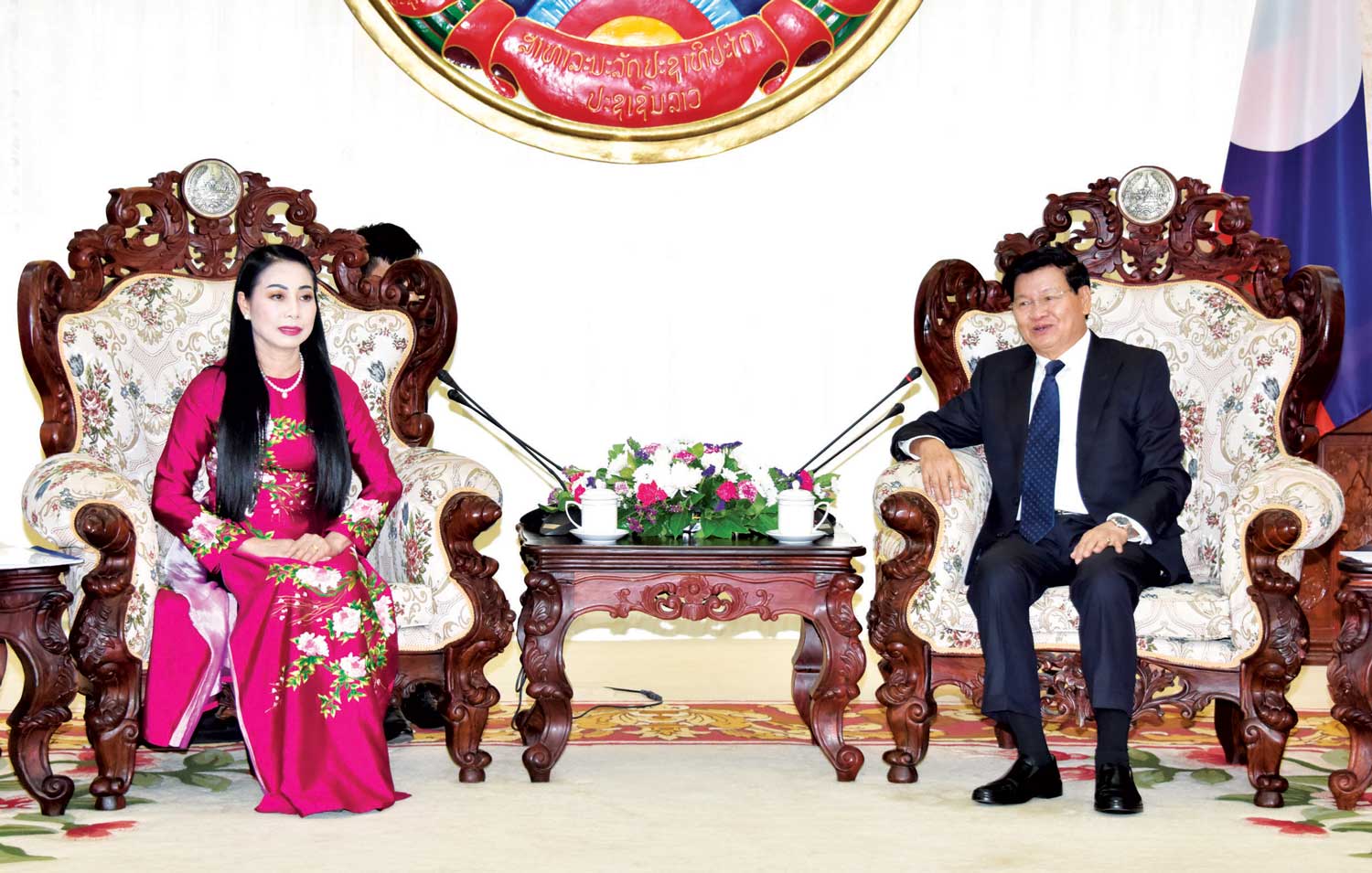 ທ່ານນາຍົກລັດຖະມົນຕີ ລາວ ທອງລຸນ ສີສຸລິດ ຕ້ອນຮັບການເຂົ້າຢ້ຽມຂໍ່ານັບ ທ່ານນາງ ຮວ່າງທິຖຸ໊ລານ ກຳມະການສູນກາງພັກ ເລຂາພັກແຂວງ ຫວິງຟຸກ ແຫ່ງ ສສ ຫວຽດນາມ |