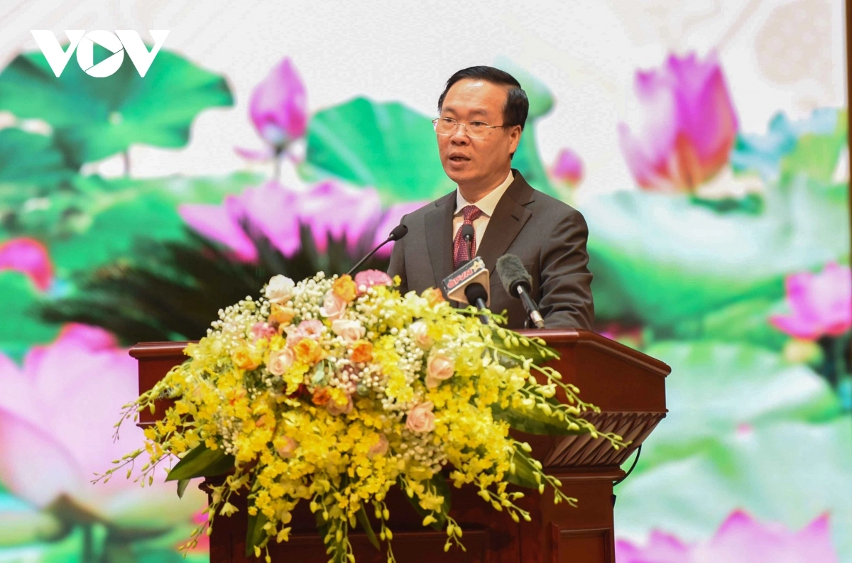 (ທ່ານປະທານປະເທດ ຫວຽດນາມ ຫວໍວັນເຖືອງ ກ່າວຄຳເຫັນຊີ້ນຳທີ່ກອງປະຊຸມ) |