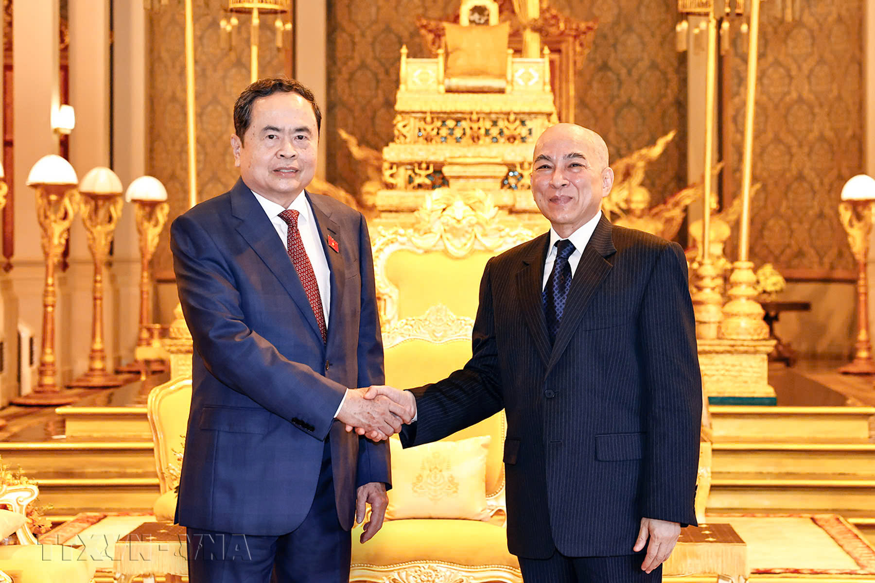 ໃນຂອບເຂດການຢ້ຽມຢາມ ກຳປູເຈຍ ຢ່າງເປັນທາງການ, ຕອນບ່າຍວັນທີ 23 ພະຈິກ, ຢູ່ພະລາຊະວັງ ກຳປູເຈຍ, ທີ່ນະຄອນຫຼວງ ພະນົມເປັນ, ທ່ານປະທານສະພາແຫ່ງຊາດ ຫວຽດນາມ ເຈິ່ນແທັງເໝີ້ນ ໄດ້ພົບປະກັບພະບາດສົມເດັດພະບໍລົມມະນຽດມະຫາກະສັດ Norodom Sihamoni ແຫ່ງລາຊະອານາຈັກກຳປູເຈຍ. ຢູ່ທີ່ນີ້, ພະບາດສົມເດັດພະບໍລົມມະນຽດມະຫາກະສັດ Norodom Sihamoni ຊົມເຊີຍທ່ານປະທານສະພາແຫ່ງຊາດ ເຈິ່ນແທັງເໝີ້ນ ໄດ້ນຳໜ້າຄະນະຜູ້ແທນຂັ້ນສູງພັກ, ລັດ ຫວຽດນາມ ໄປຢ້ຽມຢາມຢ່າງເປັນທາງການ; ທ່ານເນັ້ນໜັກວ່າ, ການຢ້ຽມຢາມເພື່ອປະກອບສ່ວນສຳຄັນເພື່ອປັບປຸງສາຍພົວພັນຖານບ້ານໃກ້ເຮືອນຄຽງພິເສດລະຫວ່າງ 2 ປະເທດ.