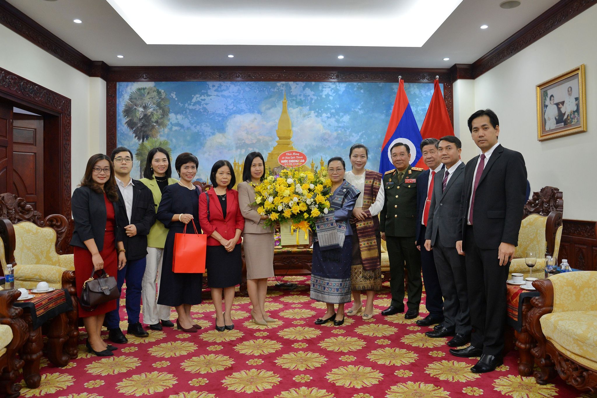 ເນື່ອງໃນໂອກາດສະເຫຼີມສະຫຼອງ 48 ປີແຫ່ງວັນ ສະຖາປະນາ ສາທາລະນະລັດ ປະຊາທິປະໄຕ ປະຊາຊົນ ລາວ (ວັນທີ 2 ທັນວາ 1975 - ວັນທີ 2 ທັນວາ 2023), ຕອນເຊົ້າວັນທີ 1 ທັນວາ, ທ່ານນາງ ຝໍເກິມຮວາ, ຫົວໜ້າພະແນກ ກະຈາຍສຽງບັນດາລາຍການພາກພາສາຕ່າງປະເທດ, ວິທະຍຸກະຈາຍສຽງ ຫວຽດນາມ(VOV5) ໄດ້ນຳໜ້າຄະນະບັນນາທິການ, ນັກຂ່າວ ລາຍການກະຈາຍສຽງພາກພາສາລາວ ມາອວຍພອນ ຢູ່ສະຖານທູດ ລາວ ປະຈຳ ຫວຽດນາມ, ເຮືອນເລກທີ 40 ຖະໜົນ ກວາງຈຸງ, ຮ່າໂນ້ຍ.