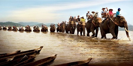 ![]() ນັກທ່ອງທ່ຽວຂີ່ຊ້າງຂ້າມແມ່ນ້ຳ