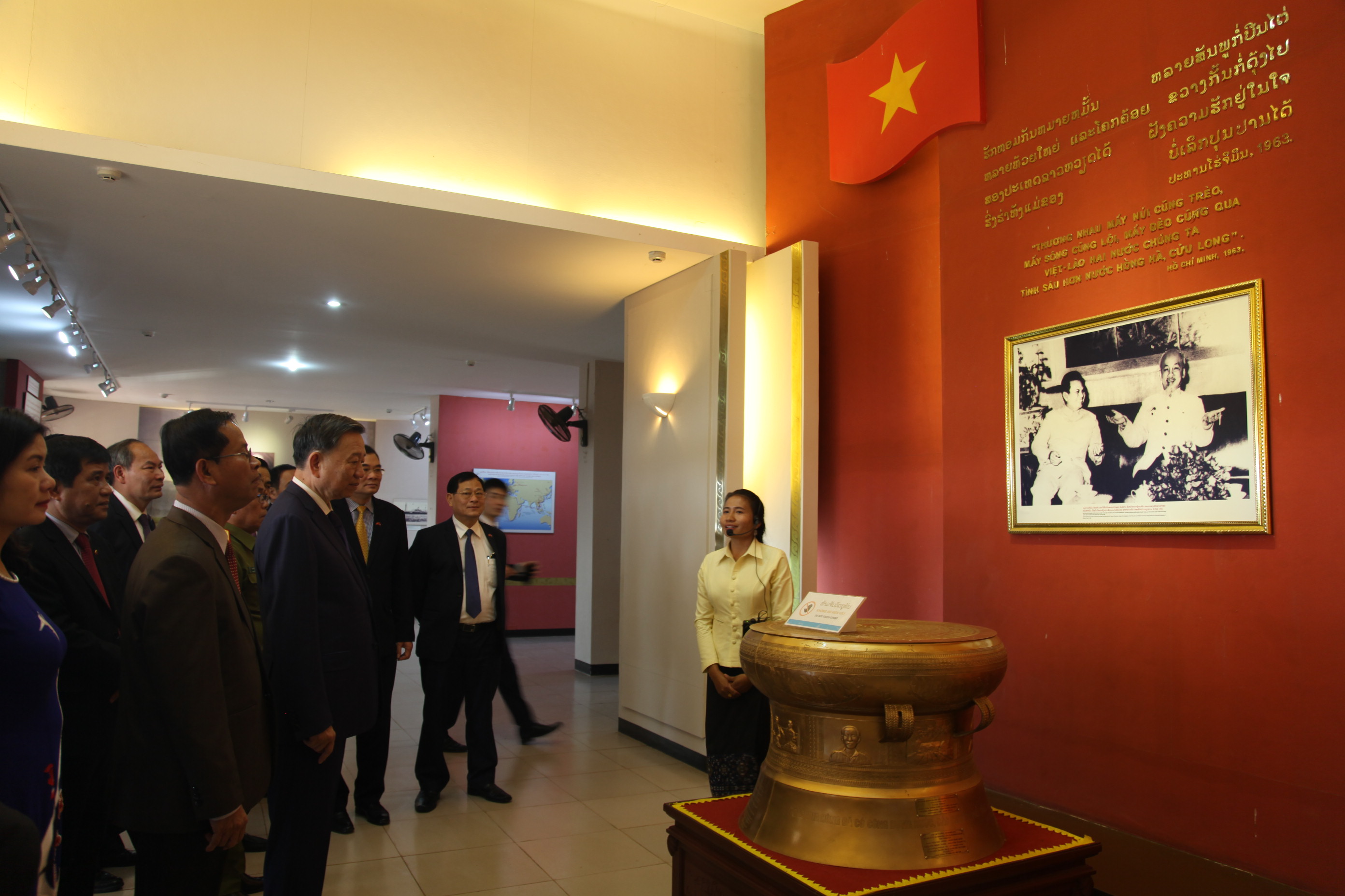 ນັກບັນລະຍາຍພວມແນະນຳຮູບພາບປະທານໂຮ່ຈີມິນ ກັບປະທານ ໄກສອນ ພົມວິຫານ ໃຫ້ແຂກເຂົ້າຊົມ |
