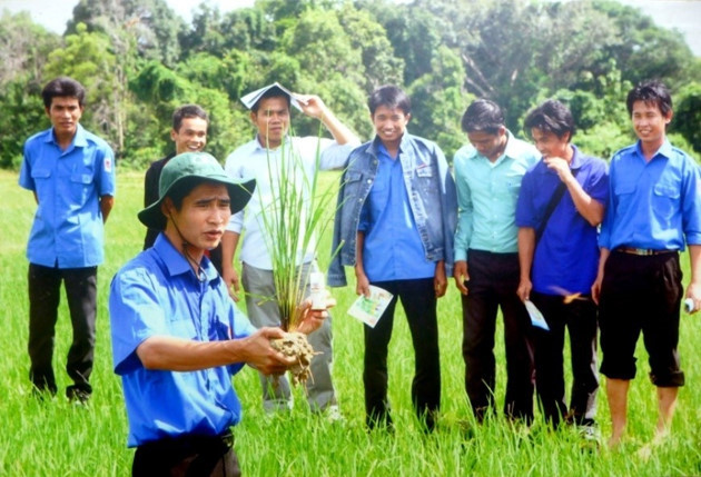 | ວັນທີ 1 ສິງຫາປີ 2010, ຢູ່ແຂວງປຳປາສັກ, ຊາວໜຸ່ມອາສາສະໝັກລະດູຮ້ອນຂຽວ ນະຄອນໂຮ່ຈິມິນ ພວມແນະນຳວິທີປູກເຂົ້າໃຫ້ສະມັດທະພາບສູງແກ່ຊາວກະສີກອນລາວ. |