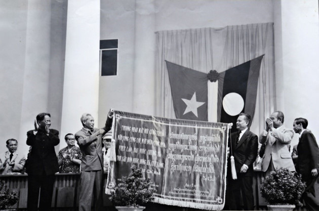 | ເດືອນກໍລະກົດປີ 1977, ຢູ່ນະຄອນຫຼວງວຽງຈັນ, ປະເທດລາວ, ທ່ານເລຂາທິການໃຫຍ່ ເວຢວນ, ທ່ານນາຍົກລັດຖະມົນຕີ ຝ້າມວັນດົງ ຕາງໜ້າສູນກາງພັກ ແລະ ລັດຖະບານຫວຽດນາມມອບຜ້າແຜ່ນໜຶ່ງໂດຍຖັກແສ່ວບົດຄຳກອນທີ່ມີຊື່ສຽງຂອງປະທານໂຮ່ຈິມິນ. |