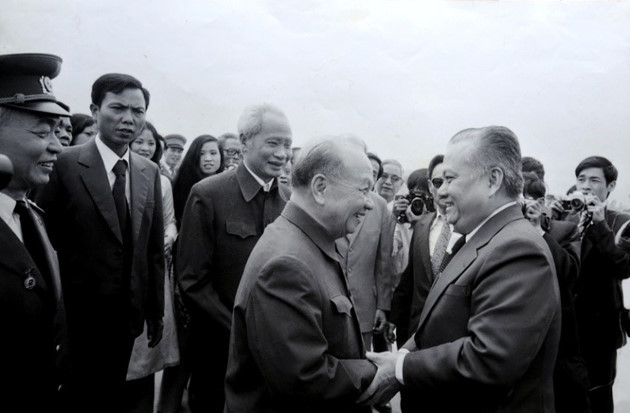 | ທ່ານ ເຈື່ອງຈິງ ປະທານສະພາແຫ່ງລັດແຫ່ງ ສ.ສ. ຫວຽດນາມ ຕ້ອນຮັບຄະນະຜູ້ແທນພັກປະຊາຊົນປະຕິວັດລາວນຳໂດຍທ່ານປະທານ ໄກສອນ ພົບວິຫານ ເນື່ອງໃນໂອກາດມາຮ່ວມກອງປະຊຸມໃຫຍ່ຄັ້ງທີ 5 ຂອງພັກກອມມູນິດຫວຽດນາມເມື່ອປີ 1982. |