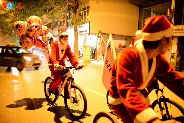 | ບັນດາເພື່ອນໜຸ່ມນຸ່ງຊຸດອາພອນ Santa Claud ໄປມອບຂອງຂວັນຢູ່ຕາມຖະໜົດສາຍຕ່າງໆຍິ່ງເຮັດໃຫ້ບັນຍາກາດວັນບຸນຄຼິດສະມາດຍິ່ງມີຊີວິດຊີວາ |