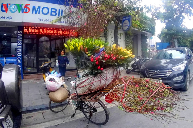 | ຢູ່ຕາມທ້ອງຖະໜົນທີ່ຄັບຄາໜາແໜ້ນໄປດ້ວຍລົດຍົນຍານພາຫະນະໄປມາ, ຮູບພາບບັນດາຖ້ຽວລົດຖືກແຊມດ້ວຍງ່າດອກຄາຍແດງ ໄດ້ກາຍເປັນສິ່ງທີ່ລຶ້ງເຄີຍຢູ່ຮ່າໂນ້ຍໃນຊຸມມື້ໃກ້ຈະຮອດບຸນເຕັດ. |