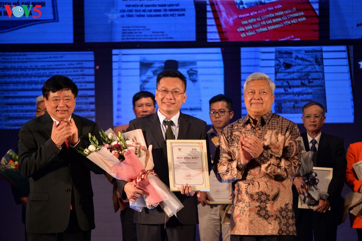 | ທ່ານຜູ້ອຳນວຍການໃຫຍ່ VOV ຫງວຽນເທ໊ກີ໋ ແລະ ທ່ານ Ibnu Hadi, ເອກອັກຄະລັດຖະທູດອິນໂດເນຍເຊຍ ມອບລາງວັນພິເສດໃຫ້ທ່ານ ຕື່ແທັງຟອງ. |
