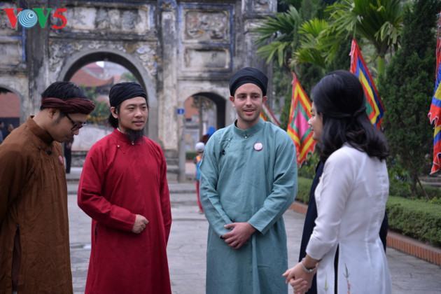 ຢູ່ເດີ່ນສາລາບ້ານ, ບັນດານັກສິລະປິນພ້ອມກັບຜູ້ຊົມໄດ້ຂັບກາບກອນ, ຂັບສຳ… ແນະນຳບັນດາຈຸດຄວາມງາມໃນບຸນເຕັດທີ່ເປັນປະເພນີຂອງຊາດ ຫວຽດນາມ ໃຫ້ແກ່ແຂກທ່ອງທ່ຽວຮັບຊາບ.