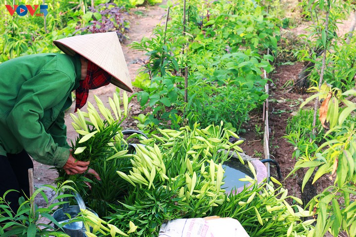 ຊໍ່ດອກລຳໂພງມັດໜຶ່ງມີ 10 ດອກຂາຍລາຄາປະມານ 35.000 ດົ່ງ.