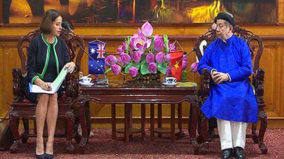 ທ່ານປະທານຄະນະກຳມະການປະຊາຊົນແຂວງ ເທື່ອທຽນເຫ້ວ ຟານງອັກເທາະ ນຸ່ງຊຸດເສື້ອຍາວ ຕ້ອນຮັບທ່ານນາງເອກອັກຄະລັດຖະທູດອົດສະຕາລີ ປະຈຳຫວຽດນາມ ເມື່ອວັນທີ 10 ກໍລະກົດ 2020. (ພາບ: thuathienhue.gov.vn) |