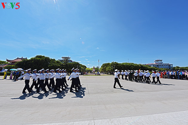 | ໃນທ່າມກາງແສງແດດຮ້ອນເອົ້າ ແລະ ລົມແຮງຢູ່ເຈື່ອງຊາ, 10 ຄຳປະຕິຍານຕົວກຽດຕິດຄຸນ, ສັດຊື່ບໍລິສຸດຂອງກອງທັບປະຊາຊົນຫວຽດນາມໄດ້ດັງກ້ອງກັງວານຂຶ້ນຊຶ່ງສະແດງໃຫ້ເຫັນຄວາມຕັດສິນໃຈປົກປັກຮັກສາອະທິປະໄຕທີ່ສັກກະລະບູຊາຂອງປະເທດຊາດ ແລະ ພ້ອມແລ້ວຈະຜ່ານຜ່າທຸກຄວາມຫຍຸ້ງຍາກເພື່ອເຮັດຫຼ້ອນໜ້າທີ່. ຫຼັງຈາກນັ້ນ, ທົ່ວກອງທັບ ແລະ ປະຊາຊົນພ້ອມກັນຮ້ອງເພງຊາດຫວຽດນາມ. |