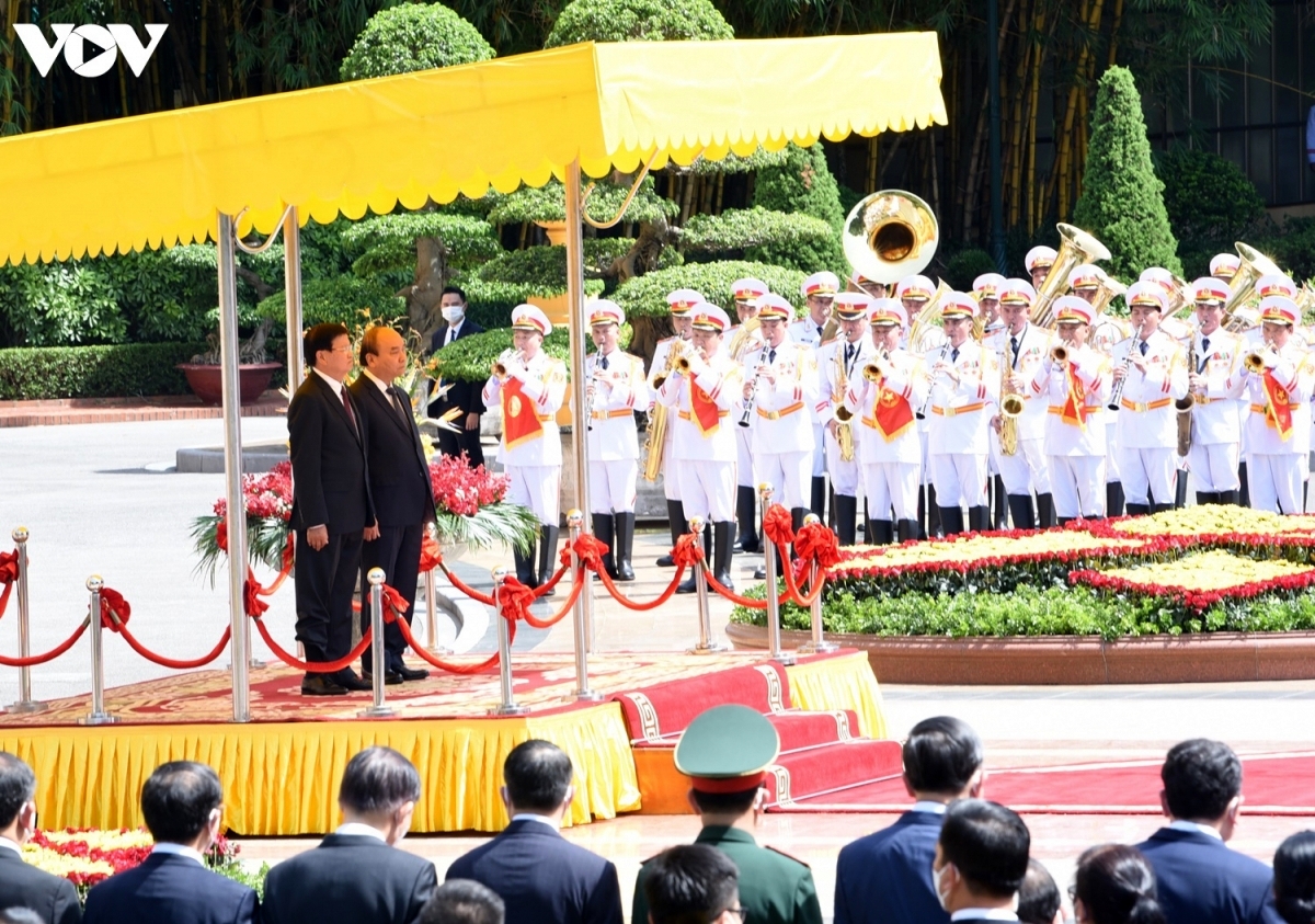 (ພາບ: ທ່ານປະທານປະເທດ ຫງວຽນຊວັນຟຸກ ແລະ ພັນລະຍາເປັນເຈົ້າພາບພິທີຕ້ອນຮັບ)