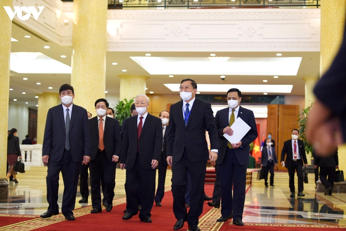 | ທ່ານເລຂາທິການໃຫຍ່ ຫງວຽນຝູຈ້ອງ ສະແດງຄວາມປິຕິຊົມຊື່ນເມື່ອທ່ານເລຂາທິການໃຫຍ່, ປະທານປະເທດລາວ ທອງລຸນ ສີສຸລິດພ້ອມກັບຄະນະຜູ້ແທນຂັ້ນສູງລາວ ມາຢ້ຽມຢາມ ແລະ ເຮັດວຽກຢູ່ຫວຽດນາມ. |
