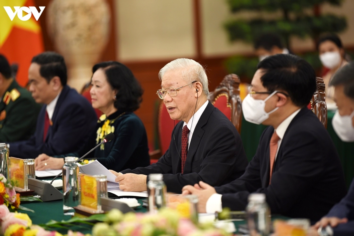 | ພາຍຫຼັງພິທີຕ້ອນຮັບ, ທ່ານເລຂາທິການໃຫຍ່ ຫງວຽນຝູຈ້ອງ ໄດ້ເປັນປະທານການພົບປະເຈລະຈາກັບທ່ານເລຂາທິການໃຫຍ່, ປະທານປະເທດລາວ ທອງລຸນ ສີສຸລິດ ຢູ່ຫ້ອງວ່າການສູນກາງພັກ. |