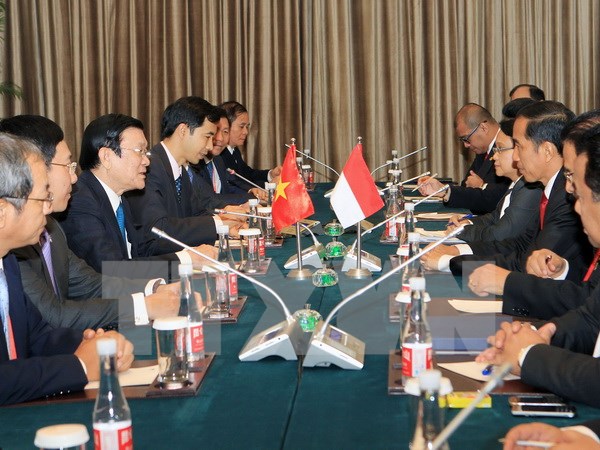 ທີ່ການພົບປະລະຫວ່າງທ່ານປະທານາທິບໍດີອິນໂດເນເຊຍ Joko Widoo ແລະ ທ່ານປະທານປະເທດຫວຽດນາມ ເຈືອງເຕີນຊາງ ຢູ່ນອກກອງປະຊຸມຂັ້ນສູງ APEC ຢູ່ປັກກິງ, ປະເທດຈີນ, ເມື່ອເດືອນ 11/2014. ການນຳ 2 ທ່ານໄດ້ເຫັນດີຍົກວົງເງິນການຄ້າ 2 ສົ້ນຂຶ້ນເຖິງ 10 ຕື້ USD ໃນປີ 2018.