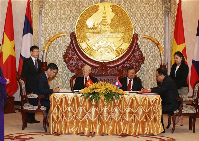 ທ່ານເລຂາທິການໃຫຍ່, ປະທານປະເທດຫວຽດນາມ ຫງວຽນຝູຈ້ອງ ແລະ ທ່ານເລຂາທິການໃຫຍ່, ປະທານປະເທດລາວ ບຸນຍັງ ວໍລະຈິດ ເປັນສັກຂີພິຍານ ພິທີລົງນາມເອກະສານຮ່ວມມື 09 ສະບັບ (ພາບ: TTXVN) |