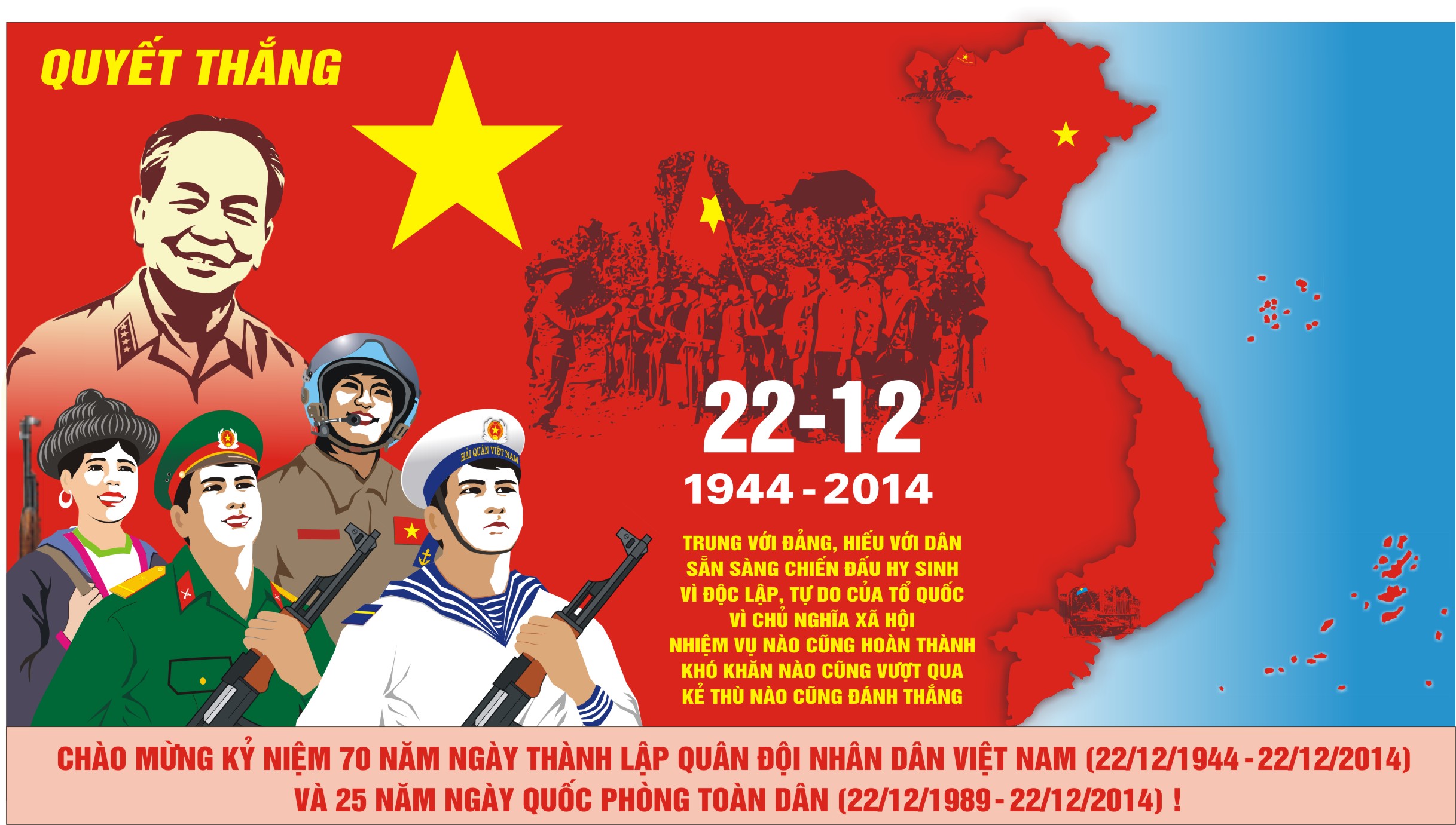 ໃນການປະຊຸມຂ່າວໂດຍຄະນະໂຄສະນາສຶກສາສູນກາງ, ກະຊວງປ້ອງກັນປະເທດ, ກະຊວງຖະແຫຼງຂ່າວ ແລະ ສື່ສານ ສົມທົບກັນຈັດຕັ້ງໃນທ້າຍເດືອນ 11 ຜ່ານມາໃຫ້ຮູ້ວ່າ, ບັນດາການເຄື່ອນໄຫວສະເຫຼີມສະຫຼອງ 70 ປີແຫ່ງວັນສ້າງຕັ້ງກອງທັບປະຊາຊົນ ຫວຽດນາມ (22/12/1944 – 22/12/2014) ແລະ 25 ປີແຫ່ງວັນປ້ອງກັນຊາດທົ່ວປວງຊົນ (22/12/1989 – 22/12/2014), 70 ປີແຫ່ງວັນມູນເຊື້ອກົມໃຫຍ່ການເມືອງກອງທັບປະຊາຊົນ ຫວຽດນາມ (22/12/1944 – 22/12/2014), ຖືກຈັດຂຶ້ນດ້ວຍລະດັບຊາດ. ກະຊວງປ້ອງກັນປະເທດສົມທົບກັບບັນດາຄະນະ, ຂະແໜງການ, ທ້ອງຖີ່ນຈັດຕັ້ງການເຄື່ອນໄຫວແທດຈິງຫຼາຍຢ່າງຄື: ພິທີຍ້ອງຍໍຊົມເຊີຍຊາວໜຸ່ມກອງທັບ ແລະ ຊາວໜຸ່ມຕຳຫຼວດ “ຮ່ຳຮຽນ ແລະ ປະຕິບັດຕາມແບບຢ່າງຄຸນສົມບັດປະທານ ໂຮ່ຈີມິນ ໄລຍະ 2012 - 2014” ໃນວັນທີ 7/12, ລາຍການ “ເດີນທາງກັບເມືອກົກເຄົ້າເຫງົ້າກໍ” ຂອງຊາວໜຸ່ມກອງທັບຖືກດຳເນີນໄປຢູ່ແຂວງ ກາວບັ່ງ, ກອງປະຊຸມສຳມະນາວິທະຍາສາດ “ກອງທັບວິລະຊົນຂອງປະເທດຫວຽດນາມ ວິລະຊົນ”, ງານວາງສະແດງຜົນງານ 70 ປີແຫ່ງການສ້າງຕັ້ງ, ແລະ ເຕີບໃຫຍ່ຂອງກອງທັບປະຊາຊົນ ຫວຽດນາມ…