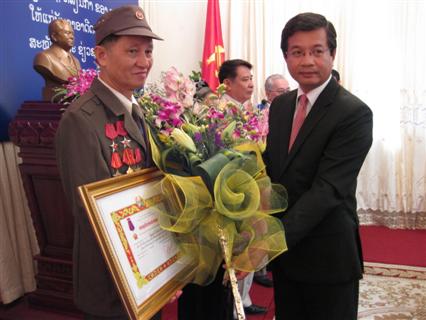 ທ່ານເອກອັກຄະລັດຖະທູດລາວປະຈຳຫວຽດນາມຕ່າງໜ້າພັກ, ລັດ ລາວມອບຫຼຽນໄຊໃຫ້ແກ່ບັນດາທະຫານ, ຜູ້ຊ່ຽວຊານອາສາສະໝັກຫວຽດນາມຊ່ວຍເຫຼືອລາວ