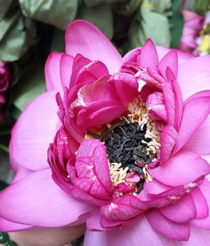 ທຳອິດ ໃຫ້ເພື່ອນກະກຽມຊາແຫ້ງ ແລະ ດອກບົວ, ດອກບົວແຕ່ລະດອກສາມາດເອືອບຊາໄດ້ປະມານ 10 – 20 ກຣາມ ຂຶ້ນກັບຂະໜາດໃຫຍ່ - ນ້ອຍຂອງແຕ່ລະດອກ. ຫຼັງຈາກນັ້ນ, ພີ່ກີບດອກບົວໃຫ້ເຫັນເກສອນ ແລ້ວ ເອົາຊາໃສ່ ຫຼັງຈາກນັ້ນ ຮຸບປາກດອກບົວເຂົ້າຄືນ ແລ້ວເອົາເຊືອກມັດ ເພື່ອບໍ່ໃຫ້ກີບດອກບົວເຕີ່ຍອອກຈາກກັນ, ກິ່ນຫອມຂອງດອກບົວຈະໄດ້ຮັກສາໄວ້ຢູ່ໃນນັ້ນ. ສຸດທ້າຍ, ແມ່ນເອົາງ່າດອກບົວນັ້ນໄປແຊ່ນ້ຳ 1 ວັນ, 1 ຄືນ ເພື່ອໃຫ້ດອກບົວສືບຕໍ່ດູດສານອາຫານ ແລະ ໃຫ້ກິ່ນຫອມຂອງດອກບົວກົມກຽວເຂົ້າກັບຊາ.
