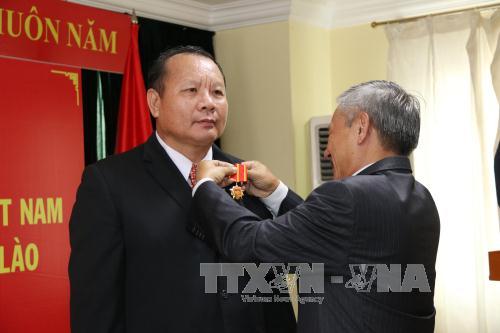 ວັນທີ 29/09 ຜ່ານມາ, ໂດຍຮັບການມອບໝາຍສິດຈາກປະທານປະເທດ ສາທາລະນະລັດ ສັງຄົມນິຍົມ ຫວຽດນາມ, ສະຖານທູດ ຫວຽດນາມ ປະຈຳ ລາວ ໄດ້ຈັດຕັ້ງພິທີມອບຫຼຽນໄຊ, ຫຼຽນກາມິດຕະພາບຂອງສາທາລະນະລັດ ສັງຄົມນິຍົມ ຫວຽດນາມ ທີ່ສະຫງວນໃຫ້ບັນດາພະນັກງານກະຊວງປ້ອງກັນຄວາມສະຫງົບ ລາວ. ນີ້ແມ່ນລາງວັນອັນສູງສົ່ງຂອງລັດ ຫວຽດນາມ ເພື່ອສະແດງຄວາມຮູ້ບຸນຄຸນຕໍ່ການຜູ້ທີ່ໄດ້ປະກອບສ່ວນຢ່າງຕັ້ງໜ້າເຂົ້າໃນການກໍ່ສ້າງ, ປັງປຸງ ແລະ ເພີ່ມທະວີສາຍພົວພັນມິດຕະພາບ, ຄວາມສາມັກຄີແບບພິເສດ ແລະ ການຮ່ວມມືຮອບດ້ານລະຫວ່າງ 2 ປະເທດ ຫວຽດນາມ ແລະ ລາວ. ທີ່ພິທີ, ທ່ານ ຫງວຽນແມ້ງຮຸ່ງ ເອກອັກຄະລັດຖະທູດ ຫວຽດນາມ ປະຈຳ ລາວ ໄດ້ມອບຫຼຽນໄຊມິດຕະພາບໃຫ້ທ່ານພັນເອກ ກຽງຄຳ ອິນເພງທະວົງ ຫົວໜ້າອົງການຕາງໜ້າກະຊວງປ້ອງກັນຄວາມສະຫງົບລາວ ປະຈຳ ຫວຽດນາມ. ທ່ານເອກອັກຄະລັດຖະທູດ ກໍ່ມອບຫຼຽນໄຊມິດຕະພາບໃຫ້ທ່ານພັນຕີ ຄຳເວີນ ໄຊຍະຈັກ ຮອງຫົວໜ້າອົງການຕາງໜ້າກະຊວງປ້ອງກັນຄວາມສະຫງົບ ລາວ ປະຈຳ ຫວຽດນາມ ແລະ ທ່ານພັນຕີ ແສງພິລາ ພະນັກງານອົງການຕາງໜ້າກະຊວງປ້ອງກັນຄວາມສະຫງົບ ລາວ ປະຈຳ ຫວຽດນາມ ຍ້ອນມີການປະກອບສວ່ນຢ່າງຕັ້ງໜ້າເຂົ້າໃນການກໍ່ສ້າງ, ປັບປຸງສາຍພົວພັນມິດຕະພາບ, ການຮ່ວມມືຮອບດ້ານລະຫວ່າງ 2 ປະເທດ ຫວຽດນາມ ແລະ ລາວ.