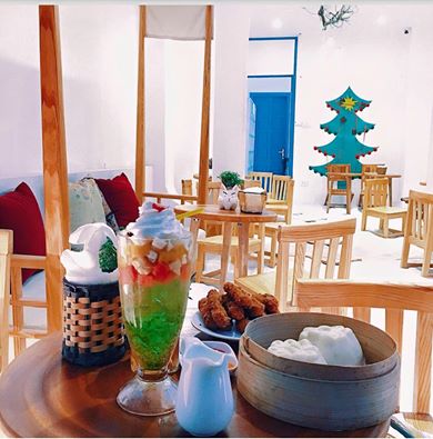 ເທິງຝາຜະໜັງສີຂາວຖືກແຂວນບັນດາໂຕຫອຍໃຫຍ່ເທົ່າກັບກຳມືທີ່ປູກເຄືອໄຕ່. ນອກນັ້ນຍັງປະດັບປະດາດ້ວຍມອງຫາປາເກົ່າອີກ, ເທິງພື້ນສີຂີ້ເທົ່າຂອງມອງຫາປາແມ່ນພົ້ນເດັ່ນຂຶ້ນດ້ວຍທຸ່ນລອຍສີສົ້ມ ແລະ ສະໝໍສີຟ້າ. ເທິງໂຕະວາງຕົ້ນໄມ້ນ້ອຍໆ, ພ້ອມກັບຕະກຽງເຕືອນພາຍຸດ້ວຍຫຼາຍສີ. ອັນໄດ້ສ້າງຄວາມຮູ້ສຶກວ່າພວມຢູ່ໃນຫາດຊາຍທະເລທີ່ຮົກເຮື້ອວ່າງເປົ່າ. ອ້າຍ ຮ່າ, ຜູ້ຄຸ້ມຄອງຮ້ານກາເຟໃຫ້ຮູ້ວ່າ: ດິນຊາຍຢູ່ໃນຮ້ານແມ່ນຖືກນຳມາຈາກທະເລ ຍາຈາງຈຶ່ງມີສີຂາວຄືແນວນັ້ນ: