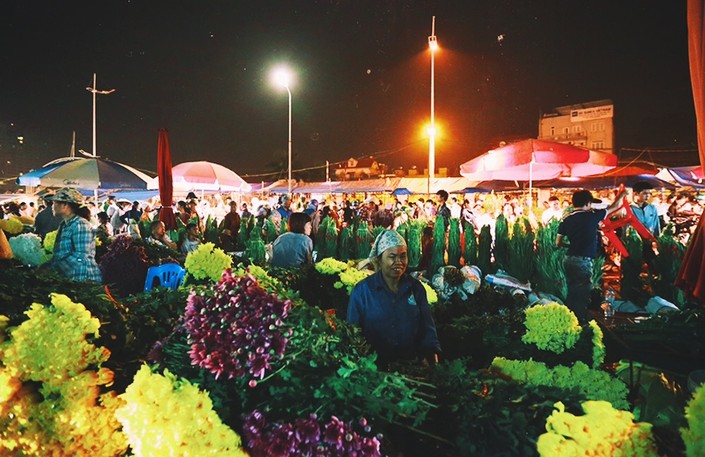 ໃນຕອນກາງຄືນ, ຕົວເມືອງ ຮ່າໂນ້ຍ ມິດສະຫງົບງຽບ, ຢູ່ເຂດຕະຫຼາດ ດອກໄມ້ ກວາງບ໋າ ຟາກຄັນຄູ ງີຕ່າມ, ຕາແສງ ກວາງອານ, ເມືອງໄຕໂຮ່ ພັດແຈ້ງສະຫວ່າງດ້ວຍດອກໄຟ, ຄັບຄາໜາແໜ້ນທັງຜູ້ຊື້ ແລະ ຜູ້ຂາຍ. ໂດຍບໍ່ຮູ້ຈັກວ່າມີມາແຕ່ເວລາໃດ, ຕະຫຼາດຂາຍດອກໄມ້ກາງຄືນກວາງບ໋າ ໄດ້ກາຍເປັນຕະຫຼາດຂາຍສົ່ງໃຫຍ່ທີ່ສຸດສຳລັບດອກໄມ້ສົດຊະນິດຕ່າງໆ ຂອງຊາວຮ່າໂນ້ຍ. ໄປຕະຫຼາດຂາຍດອກໄມ້ກາງຄືນແມ່ນຈັບອົກຈັບໃຈທີ່ສຸດ .