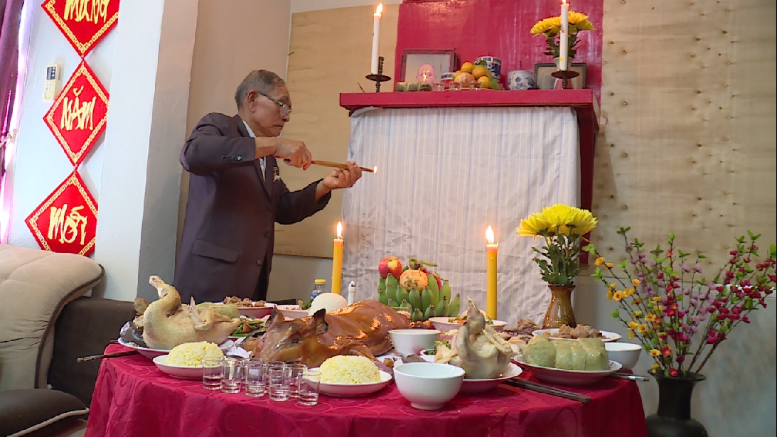 ໃນຂະນະດຽວກັນນັ້ນ, 2 ຜົວເມຍລຸງ ຕ໊ວຽນ ກໍ່ເຊັດຖູຮ້ານບູຊາບັນພະບຸລຸດ, ຈັດພາໝາກໄມ້ 5 ຊະນິດ, ຕັ້ງຕົ້ນດອກເໝີຍ, ຕົ້ນດອກຄາຍຢູ່ຂ້າງຮ້ານບູຊາ…ນີ້ແມ່ນວຽກທີ່ລຸງເຮັດໃນຍາມບຸນເຕັດ. ລຸງ ຕ໊ວຽນ ແບ່ງປັນວ່າ: