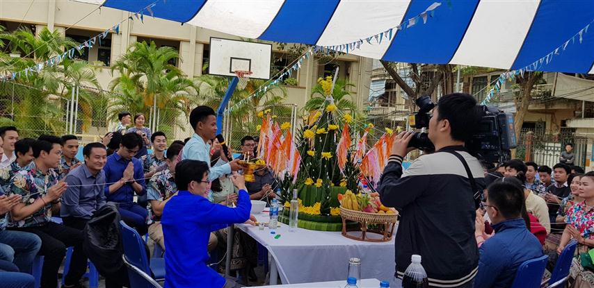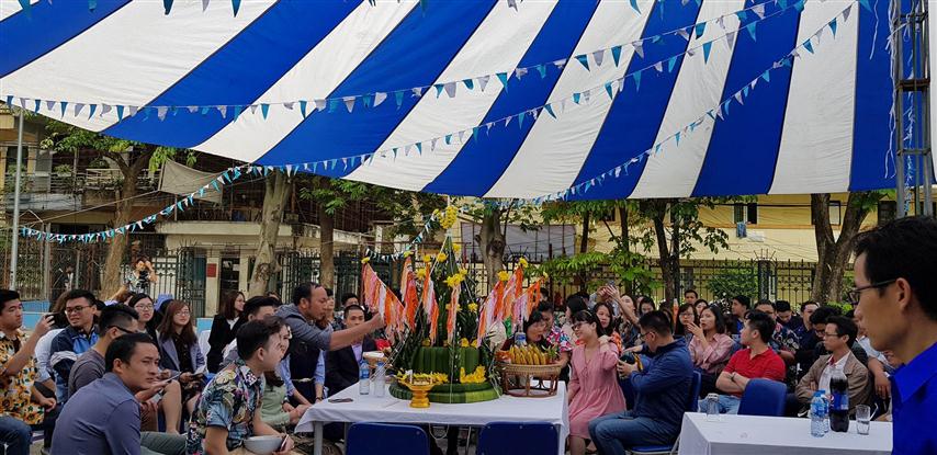 ເຂົ້າຮ່ວມພິທີຕ້ອນຮັບບຸນປີໃໝ່ ໃນວັນພັກທ້າຍອາທິດຢູ່ສະຖາບັນການຕ່າງປະເທດ, ເຊິ່ງແມ່ນໂຮງຮຽນມີນັກສຶກສາ, ນັກຄົ້ນຄວ້າລາວ ເກືອບ 100 ຄົນ ທີ່ພວມຮ່ຳຮຽນຢູ່ໂຮງຮຽນນີ້ ຈຶ່ງເຫັນໄດ້ຄວາມເອົາໃຈໃສ່ຈາກຄູອາຈານ, ໂຮງຮຽນທີ່ສະຫງວນໃຫ້ພວກເພື່ອນ. ເຖິງວ່າແມ່ນວັດພັກການກໍ່ຕາມ, ແຕ່ບັນດາຄູອາຈານ, ຜູ້ຕາງໜ້າບັນດາພະແນກ, ຫ້ອງການຂອງສະຖາບັນ ກໍ່ສະຫງວນເວລາເຂົ້າຮ່ວມພິທີຕ້ອນຮັບບຸນປີໃໝ່ຢ່າງເບີກບ່ານມ່ວນຊື່ນກັບນັກສຶກສາລາວ. ຢູ່ເດີນບ້ວງໃນບໍລິເວນສະຖາບັນ, ຜ້າປົກຖືກກັ້ງກັນແດດແທນຫຼັງຄາ, ຜ້າສີຂາວໄດ້ປົກໃສ່ໂຕະເກືອບ 20 ໜ່ວຍ ຖືກຈັດເປັນແຖວ, ພ້ອມທັງມີຈອກ ແລະ ນ້ຳໄດ້ວາງໄວ້ແລ້ວ. ໂຕະຂອງຜູ້ແທນໄດ້ມີຊໍ່ດອກໄມ້ສົດທີ່ນ້ອຍໆ ເຊິ່ງບັນດານັກສຶກສາຫວຽດນາມ - ລາວ ໄດ້ປະດັບປະດາ. ພາຍຫຼັງການແນະນຳຜູ້ແທນ, ການກ່າວຄຳເຫັນພິທີ, ຕໍ່ຈາກນັ້ນຮອດຂັ້ນຕອນທຳພິທີ.