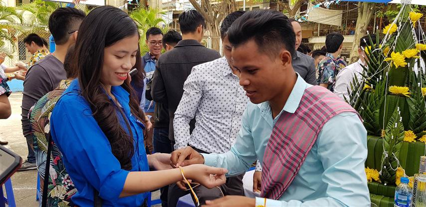 ອຸທະສັກ, ນັກສຶກສາມະຫາວິທະຍາໄລອຸດສາຫະກຳ ພວມອວຍພອນໄຊໃຫ້ເພື່ອນຂອງຕົນປີໃໝ່ມີຄວາມໂຊກດີ, ທັງອວຍພອນ, ມືຈັບເສັ້ນຝ້າຍແກວງໄປແກວງມາກ່ອນທີ່ມັດເສັ້ນຝ້າຍສີເຫຼືອງ, ສີຂາວໃສ່ແຂນຂອງເພື່ອນ. ພາຍຫຼັງມັດແຂນແລ້ວ, ອຸທະສັກ ຍັງເປົ່າໃສ່ບ່ອນມັດອີກ.