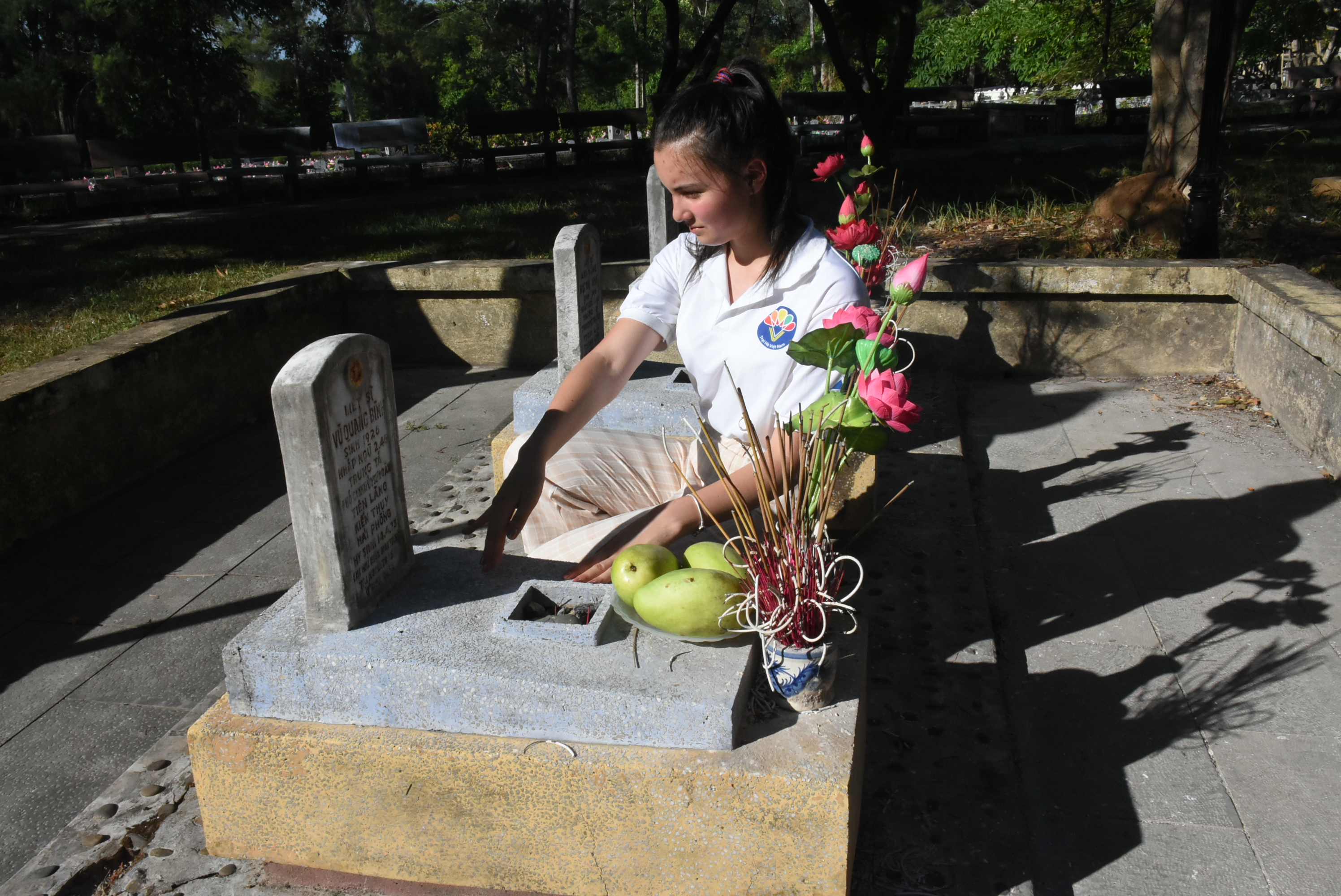 ຫ່າງຈາກເຂດຂຸມຝັງສົບບັນດານັກຮົບເສຍສະຫຼະຊີວິດນີລະນາມໄປບໍ່ໄກ, ຢູ່ເຂດຂຸມຝັງສົບບັນດານັກຮົບເສຍສະຫຼະຊີວິດຫາຍຟ່ອງ, ເພື່ອນ ວູ ຕາຍຊາ ໂຕ໊ເວິນ, ແມ່ນນາງສາວທີ່ມີ 2 ສາຍເລືອດຫວຽດນາມ ແລະ ຢູແກຼນ, ພວມເພື່ອນເຊັດຖຸໄຄຢູ່ທີ່ຂຶ້ນຫຸ້ມຂຸມຝັງສົບຂອງພໍ່ປູ່. ສຳລັບ ນາງ ໂຕ໊ເວິນ ຄວາມຊົງຈຳກ່ຽວກັບພໍ່ປູ່ຂອງຕົນ ແມ່ນນັກຮົບເສຍສະຫຼະຊີວິດເພື່ອຊາດ ວູກວາງບິ່ງ, ບ້ານເກີດຢູ່ເມືອງ ກ້ຽນຖຸຍ, ຫາຍຟ່ອງ, ໄດ້ເສຍສະຫຼະຊີວິດເມື່ອປີ 1973 ໃນສົງຄາມຕ້ານຈັກກະພັດອາເມລິກາ. ຢູ່ສຸສານແຫ່ງນີ້ແມ່ນແຫ່ງພົບປະຂອງພໍ່ປູ່ ແລະ ຫຼານພາຍຫຼັງເກືອບເຄິ່ງສະຕະວັດທີ່ປະເທດຊາດມີສັນຕິພາບ, ໂຮມປະເທດຊາດເປັນເອກະພາບ.