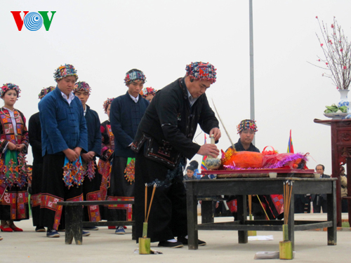 ໃນເດີນບ້ານທີ່ກ້ວາງໃຫຍ່, ໝໍພອນຊາວເຜົ່າ ໂລໂລ ຢູ່ເມືອງແມ່ວຫວາກ ແຂວງຮ່າຢາງ ພວມອ່ານບົດສະດຸດີເຊື້ອເຊີນເທວະດາຟ້າແຖນມາເປັນສັກຂີພິຍານພິທີພາວະນາຟ້າຝົນຂອງຊາວບ້ານ. ພິທີພາວະນາຟ້າຝົນຂອງຊາວເຜົ່າ ໂລໂລໄດ້ຮັບເລືອກເປັນການເຄື່ອນໄຫວເປີດສາກໃຫ້ວັນບຸນ“ສີສັນລະດູບານໃໝ່ໃນທຸກແຖບຖິ່ນທົ່ວປະເທດຊາດ” ປີນີ້. ທ່ານໂຮ່ຫວຽດເຊີນ ຜູ້ອຳນວຍການສູນວັດທະນະທຳແຂວງ ຮ່າຢາງ ໃຫ້ຮູ້ວ່າ :
