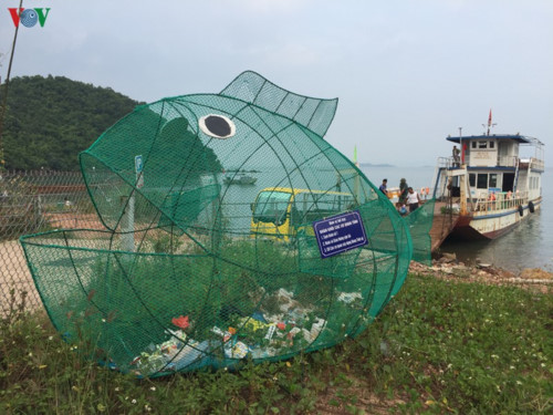 ໂດຍໄດ້ເຮັດມາຈາກໂຄງເຫຼັກ ແລະ ສ້າງເປັນຮູບດ້ວຍຕາໜ່າງມີລວງຍາວປະມານ 5 ແມັດ, ສູງ 2 ແມັດ. ບໍ່ພຽງແຕ່ສ້າງຄວາມປະທັບໃຈເທົ່ານັ້ນ, ບັນດາ "ແນວໃສ່ຂີ້ເຫຍື້ອຮູບໂຕປາ"ນັ້ນ ຍັງນຳເອົາສານກ່ຽວກັບສິ່ງແວດລ້ອມມາໃຫ້ແຂກທ່ອງທ່ຽວ ແລະ ປະຊາຊົນເປັນເຈົ້າການເກັບ ແລະ ຖອກຂີ້ເຫຍື້ອຢາງປຼາດສະຕິກໃຫ້ຖືກຕາມບ່ອນທີ່ກຳນົດໄວ້. ປ້າ ລຶວຮ່າອານ, ແຂກທ່ອງທ່ຽວທີ່ມາຈາກແຂວງ ຮ່ວາບີ່ງ ໃຫ້ຮູ້ວ່າ: