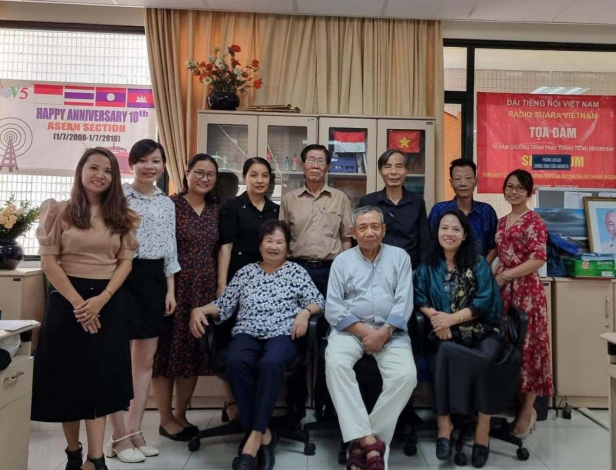 ທ່ານ Susanto (ນເລວັນເຖາະ ), (ນຸ່ງໂສ້ງສີຂາວ, ນັງ່ແຖວໜ້າ) ນັກຊ່ຽວຊານພາກພາສາອິນໂດເນເຊຍຖ່າຍຮູບພ້ອມກັບບັນດາພະນັກງານລາຍການພາກພາສາອິນໂດເນເຊຍ |
