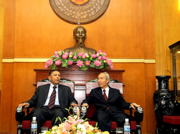 ![]() ທ່ານ ຮູ່ນດ໋າມ, ປະທານຄະນະກຳມະການສູນກາງແນວໂຮມປະເທດຊາດ ຫວຽດນາມ ຕ້ອນຮັບທ່ານເອກອັກຄະລັດຖະທູດ ອິນເດຍ Ranjit Rea