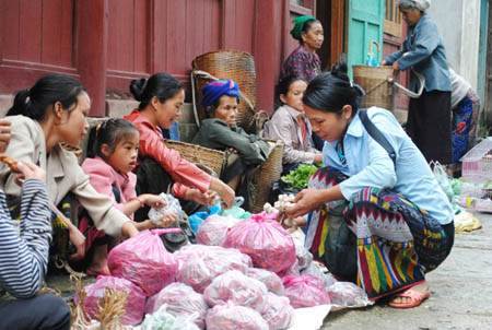 ![]() ຕະຫລາດນັດ ນາແມ່ວ ນຳໃຊ້ທັງສອງສະກຸນເງິນ ນັ້ນແມ່ນເງິນກີບຂອງລາວ ແລະ ເງິນດົງຂອງຫວຽດນາມ