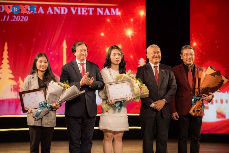 ດິງທິທ໊າຍລິງ ຜູ້ໄດ້ຮັບລາງວັນທີ 2 ແລະ ຫງວຽນທິເຮືອງ ຜູ້ໄດ້ຮັບລາງວັນທີ 3 ໃນການເສັງ “Aku dan ອິນໂດເນເຊຍ” |