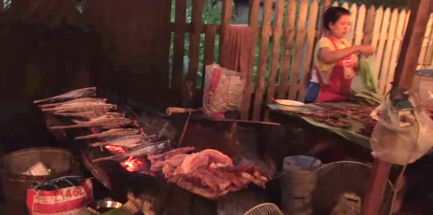 ຍ່າງເຂົ້າໄປໃນຕື່ມອີກປະມານ 50 ແມັດ, ຢູ່ບັນດາຮ່ອມທາງແຄມຖະຫນົນຂອງຕະຫລາດມມືດທ່ານຈະເຫັນບັນຍາກາດອຶກກະທຶກຄຶກໂຄມຂອງເຂດອາຫານການກິນ ດ້ວຍເຍື່ອງອາຫານພື້ນເມືອງຫລາຍເຍື່ອງຂອງລາວຄື: ປີ້ງໄກ່, ປີ້ງປາ, ຕຳໝາກຮຸ່ງ… ນັກທ່ອງທ່ຽວສາມາດຊື້ຂອງກິນເອົາໄປ ຫລືກິນຢູ່ກັບທີ່ກໍໄດ້. ຈຸດທີ່ເປັນເອກະລັກສະເພາະ ດຶງດູດນັກທ່ອງທ່ຽວກໍຄືຊາວທ້ອງຖິ່ນເປັນຈຳນວນຫລວງຫລາຍ ນັ້ນແມ່ນ ຕະຫລາດແຫ່ງນີ້ຂາຍຂອງກິນຕາມແບບ buffet. ຮ້ານອາຫານແຕ່ລະຮ້ານລ້ວນແຕ່ ແຂວນປ້າຍໂຄສະນາ “Welcom Luang Prabang Buffet”. ເອື້ອຍ ຈິດຕະວົງ ຂາຍເຍື່ອງອາຫານຂອງລາວ ຢູ່ ຕະຫລາດແຫ່ງນີ້ ແບ່ງປັນວ່າ: