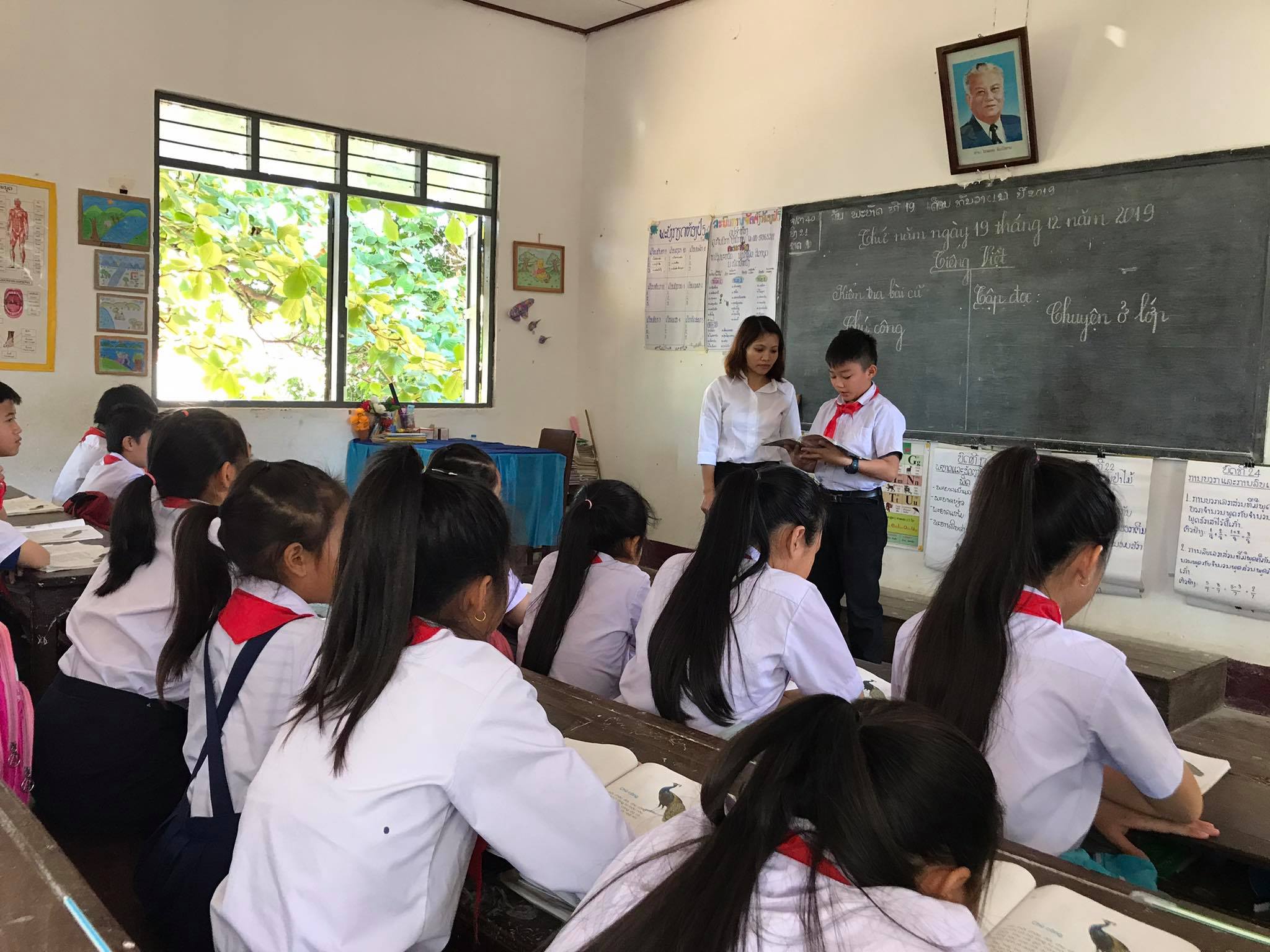 ໃນການໂອ້ລົມສົນທະນາ, ຜູ້ອຳນວຍການໂຮງຮຽນ ໄດ້ແນະນຳໃຫ້ພວກຂ້າພະເຈົ້າມີຄວາມເຂົ້າໃຈຢ່າງເລິກເຊິ່ງກວ່າກ່ຽວກັບການຮຽນ, ການສອນ ພາສາ ຫວຽດ ໃຫ້ແກ່ລູກຫຼານຊາວຫວຽດນາມທີ່ ອາໄສຢູ່ທີ່ນີ້ ແລະ ລູກຫຼານຊາວ ລາວ ທີ່ພວມຮ່ຳຮຽນຢູ່ໂຮງຮຽນແຫ່ງນີ້. ປັດຈຸບັນ, ໂຮງຮຽນແຫ່ງນີ້ ພວມນຳໃຊ້ຕຳລາຮຽນດ້ວຍ ພາສາ ຫວຽດ ເພື່ອສອນໃຫ້ແກ່ເດັກແຕ່ ປໍ 1 ຫາ ປໍ 5. ທາງໂຮງຮຽນກໍປະສົບກັບຄວາມຫຍຸ້ງຍາກບາງຢ່າງກ່ຽວກັບຕຳລາຮຽນ, ປຶ້ມຂຽນຂອງນັກຮຽນ ແລະ ເພື່ອແກ້ໄຂບັນຫາດັ່ງກ່າວ ຄູອາຈານໄດ້ຂຽນໃສ່ກະດານເພື່ອໃຫ້ນັກຮຽນຈົດໃສ່ປື້ມ.