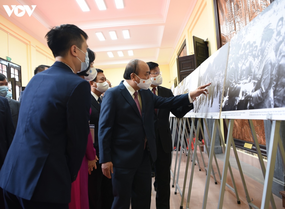 ທ່ານປະທານປະເທດຫວຽດນາມ ຫງວຽນຊວັນຟຸກ ແລະ ທ່ານເລຂາທິການໃຫຍ່, ປະທານປະເທດ ລາວ ທອງລຸນ ສີສຸລິດ ພ້ອມດ້ວຍການນຳຂັ້ນສູງສອງປະເທດ ຢ້ຽມຊົມພາບຖ່າຍກ່ຽວກັບການຮ່ວມສໍນພັນສູ້ຮົບລະຫວ່າງ ຫວຽດນາມ - ລາວ |
