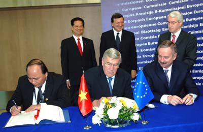 ( vovworld ) – ວັນທີ 27/6, ຢູ່ Brussel ປະເທດແບນຊິກ, ທ່ານ Pham Binh Minh ລັດຖະມົນຕີການຕ່າງປະເທດຫວຽດນາມ ແລະ ທ່ານນາງ Catherine Ashton ກຳມະການຂັ້ນສູງ ຮັບຜິດຊອບນະໂຍບາຍຄວາມໝັ້ນຄົງ ແລະ ການຕ່າງປະເທດຂອງສະຫະພາບເອີລົບ (EU) ໄດ້ລົງນາມໃນສັນຍາຄູ່ຮ່ວມມື ແລະ ຮ່ວມມືຮອບດ້ານລະຫວ່າງຫວຽດນາມ-EU (PCA) ແລະ ເປີດສາກວິວັດທະນາການເຈລະຈາສັນຍາການຄ້າເສລີສອງຝ່າຍ (FTA). ເຫດການນີ້ໄດ້ເປີດສາກໃຫ້ໄລຍະໃໝ່ ໃນການພົວພັນລະຫວ່າງຫວຽດນາມ-EU, ແມ່ນປະຖົມປັດໄຈສຳຄັນເພື່ອໃຫ້ຫວຽດນາມ ແລະ EU ສ້າງກົນໄກຮ່ວມມືລະອຽດ, ປະກອບສ່ວນເພີ່ມທະວີການພົວພັນຄູ່ຮ່ວມມື ແລະ ການຮ່ວມມືສອງຝ່າຍໃນຊຸມປີຕໍ່ໄປ.