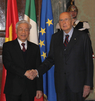 “ການພົວພັນລະຫວ່າງ ຫວຽດນາມ ແລະ ອີຕາລີ ພວມພັດທະນາຢ່າງຕັ້ງຫນ້າທີ່ສຸດ.ສະແດງອອກຜ່ານເລື່ອງ: ທີຫນຶ່ງ ອີຕາລີ ໄດ້ຮັບຮູ້ກົດລະບຽບພື້ນຖານເສດຖະກິດການຕະຫລາດຂອງ ຫວຽດນາມໃນປີ 2012, ປາດຖະຫນາຢາກສ້າງການພົວພັນຄູ່ຮ່ວມມືຍຸດທະສາດກັບ ຫວຽດນາມ. ການຢ້ຽມຢາມທີ່ສຳຄັນຂອງທ່ານເລຂາທິການໃຫຍ່ ຫງວຽນຟູຈ້ອງ ຄັ້ງນີ້ ກໍແມ່ນເພື່ອສະເຫລີມສະຫລອງ 40 ປີແຫ່ງວັນສ້າງຕັ້ງສາຍພົວພັນທາງການທູດ ລະຫວ່າງ ຫວຽດນາ ແລະ ອີຕາລີ, ສ້າງເປັນຂີດໝາຍໃນໄລຍະແຫ່ງການພັດທະນາການພົວພັນລະຫວ່າງສອງປະເທດ ໃນ 40 ປີຜ່ານມາ.”
