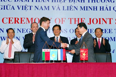 ![]() ທ່ານ ຫວູຮູຍຮ່ວາງ, ລັດຖະມົນຕີວ່າການກະຊວງອຸດສາຫະກຳ - ການຄ້າ ແລະ ທ່ານ Andrei A. Slepnhev ລັດຖ່ະມົນຕິກະຊວງການຄ້າ ຄະນະກຳມະການເສດຖະກິດອາຊີ -ເອີລົບ