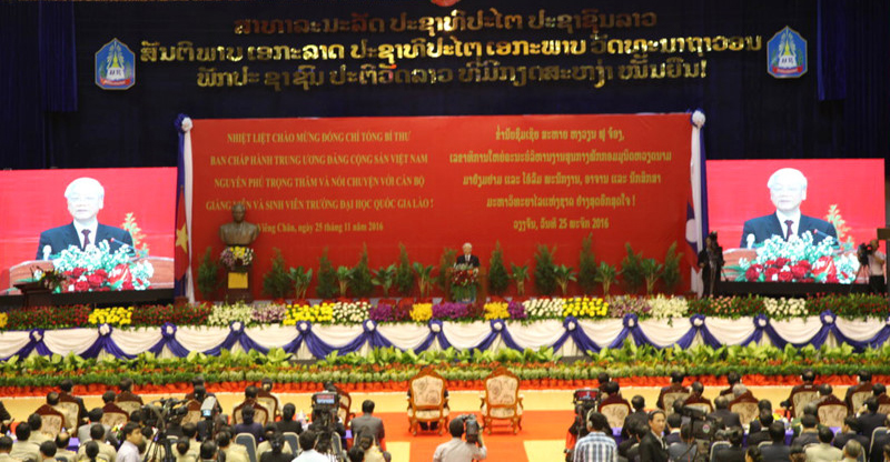 ![]() ທ່ານເລຂາທິການໃຫຍ່ພັກກອມມູນິດຫວຽດນາມ ຫງວຽນຟູ້ຈ້ອງກ່າວຄຳເຫັນທີ່ມະຫາວິທະຍາໄລແຫ່ງຊາດລາວ |
