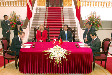 (vovworld-) ວັນທີ 8/11, ທ່ານນາງ Helle Thorning Schiomidt ນາຍົກລັດຖະມົນຕີແຫ່ງລາຊະອານາຈັກແດນມາກໄດ້ດຳເນີນບັນດາການເຄື່ອນໄຫວໃນຂອບເຂດການຢ້ຽມຢາມຫວຽດນາມຢ່າງເປັນທາງການຕາມຄຳເຊີນຂອງ ທ່ານນາຍົກລັດຖະມົນຕີຫວຽດນາມ Nguyen Tan Dung .ເຖິງວ່າດຳເນີນການ ຢ້ຽມຢາມໃນເວລາອັນສັ້ນໆກໍຕາມ, ແຕ່ການຢ້ຽມຢາມຂອງທ່ານນາງ Helle Thorning Schiomidt ນາຍົກລັດຖະ ມົນຕີ ຫ່ງລາຊະອານາຈັກແດນມາກຄັ້ງນີ້ ແມ່ນສັນຍານສະແດງໃຫ້ເຫັນການພົວພັນ 2 ຝ່າຍລະຫວ່າງແດນມາກ ແລະ ຫວຽດນາມຊຶ່ງໄດ້ ແລະພວມໄດ້ຮັບການປັບປຸງຢ່າງໝັ້ນຄົງໜັກແໜ້ນ, ພິເສດແມ່ນໃນຂົງເຂດເສດຖະກິດການຄ້າ ແລະ ການລົງທຶນ.