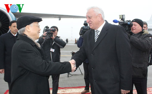 (vovworld)- ວັນທີ 26/11, ທ່ານເລຂາທິການໃຫ່ຍຄະນະບໍລິຫານງານສູນກາງພັກກອມມູນິດຫວຽດນາມ ຫງວຽນຟູຈ້ອງ ໄດ້ເລີ່ມຕົ້ນການຢ້ຽມຢາມສາທາລະນະລັດເບລາຣຸດ ຢ່າງເປັນທາງການ. ການຢ້ຽມຢາມເພື່ອແນໃສ່ປັບປຸງສາຍພົວພັນອັນເປັນມູນເຊື້ອ, ສ້າງຄວາມໄວ້ເນື້ອເຊື່ອໃຈດ້ານການເມືອງ, ແລກປ່ຽນບັນດາມາດຕະການສົມທົບກັນເຄື່ອນໄຫວໃນເວທີສາກົນ.